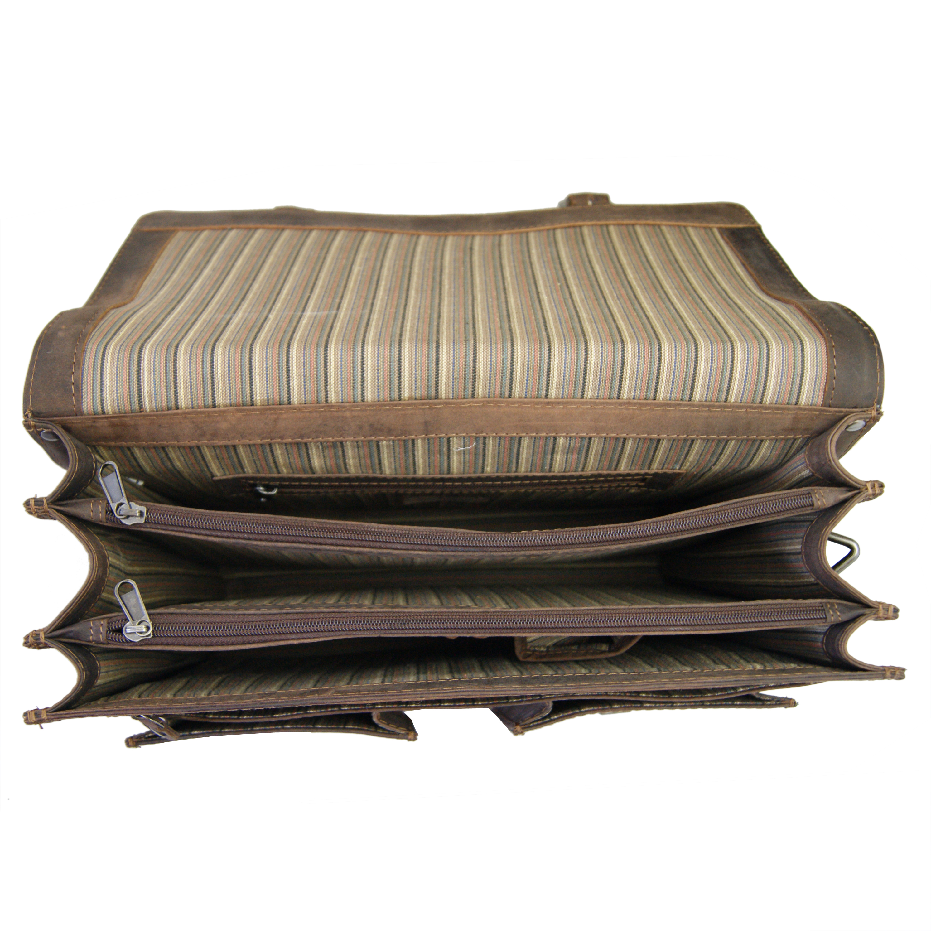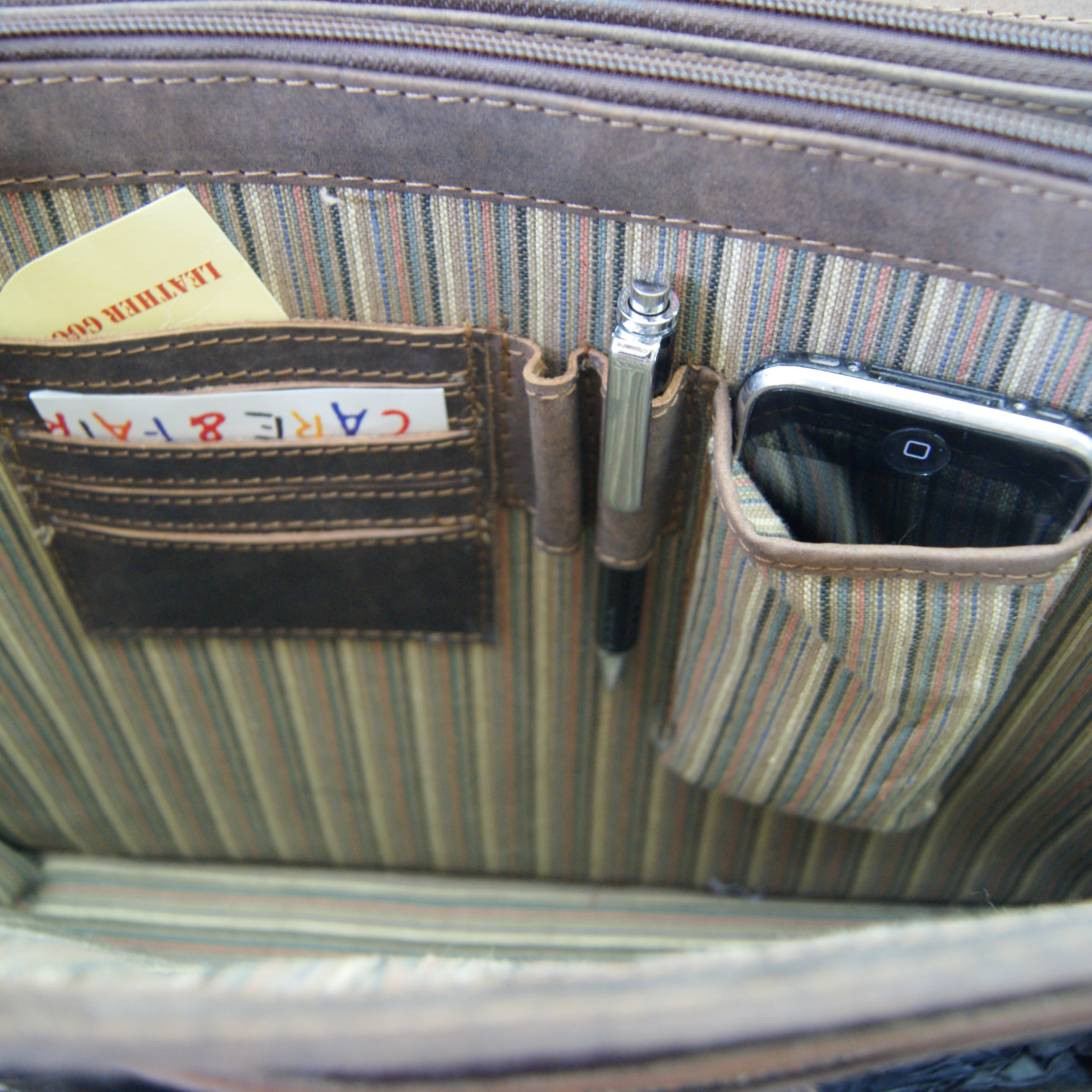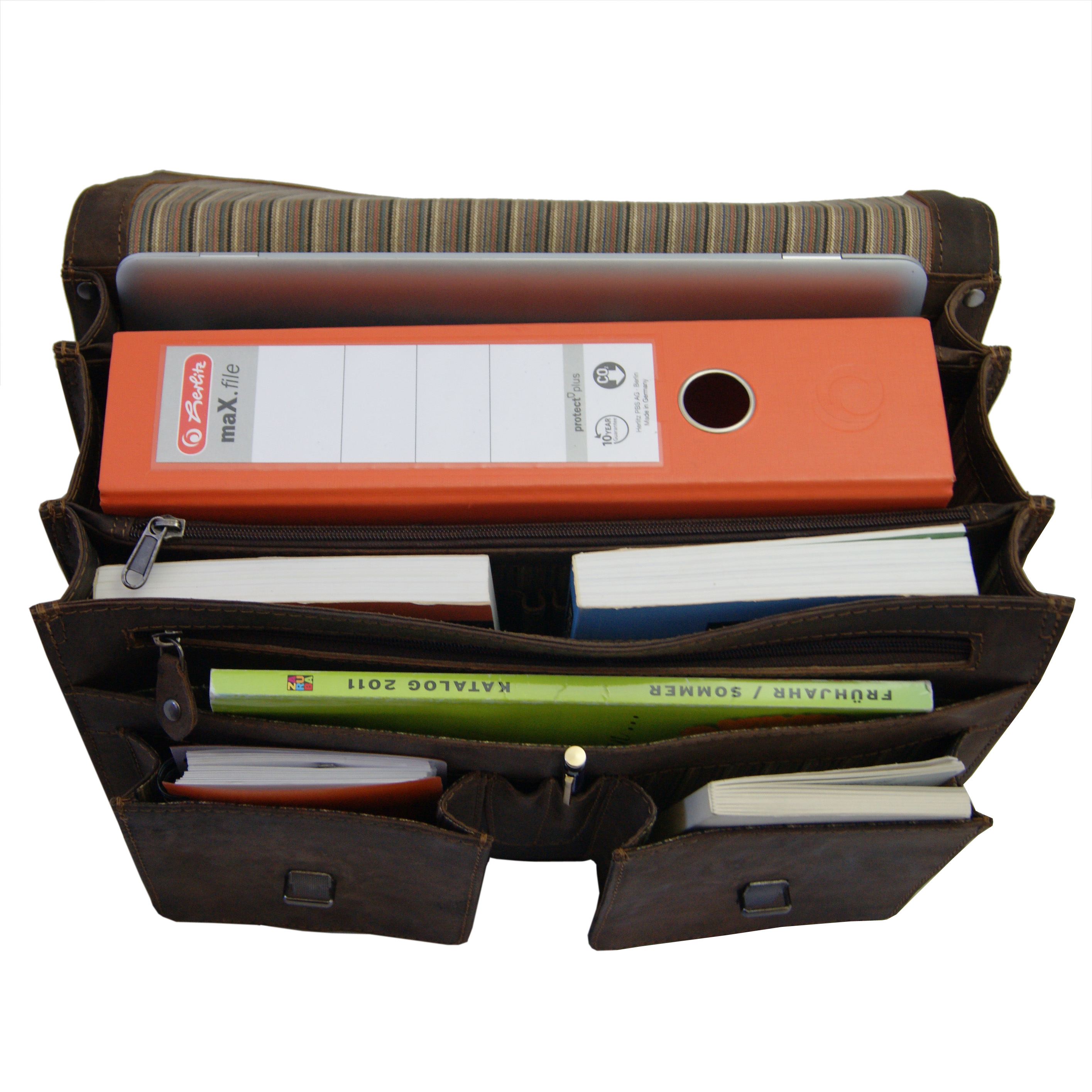 Öffnen Sie Ihre Aktentasche aus Leder! Sie sehen drei Fächer, in denen Sie ganz bequem Ihre Unterlagen sowie Ihr Notebook verstauen können. In dem Reißverschlussfach in der Mitte liegen Ihre vertraulichen Dokumente gut geschützt vor dem Zugriff Unbefugter. Der Innenorganizer ist ein sicherer Ort für Ihr Handy, Stifte und Visitenkarten. Abgerundet wird der Komfort durch zwei große Vordertaschen.