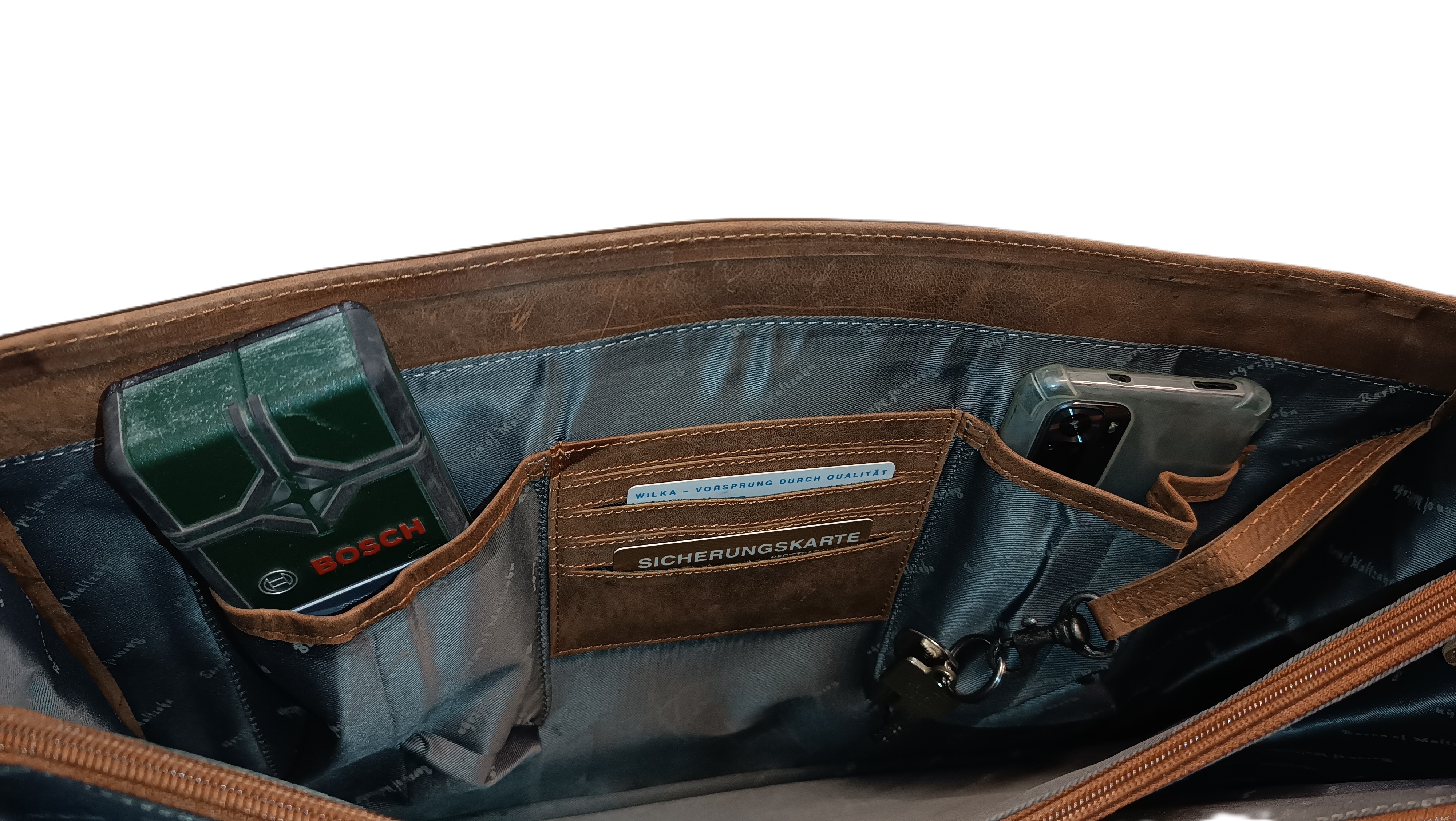 Ihre Pocketkamera, das Handy, die Visitenkarten und die Stifte können sie gut in den dafür vorgesehen Taschen und Laschen aufbewahren.